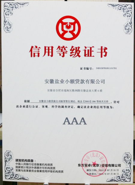 近日,安徽省金融工作辦公室公布安徽省小額貸款公司2014年度信用評(píng)級(jí)結(jié)果,徽鹽小貸公司連續(xù)兩年被評(píng)定為最高等級(jí)AAA級(jí)。