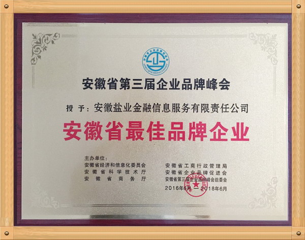 2016年6月18日,由安徽省經(jīng)濟(jì)和信息化委員會、安徽省科學(xué)技術(shù)廳、安徽省商務(wù)廳、安徽省工商行政管理局、安徽省企業(yè)品牌促進(jìn)會,共同舉辦的“安徽省笫三屆企業(yè)品牌峰會”在省人大會議中心舉行。安徽鹽業(yè)金融信息服務(wù)有限責(zé)任公司(簡稱徽鹽金融)榮獲“安徽省最佳品牌企業(yè)”獎項(xiàng)并受邀參加本次會議。