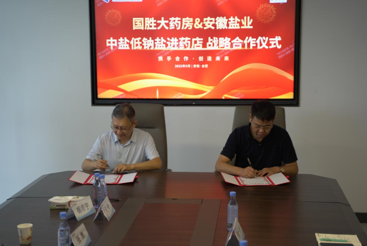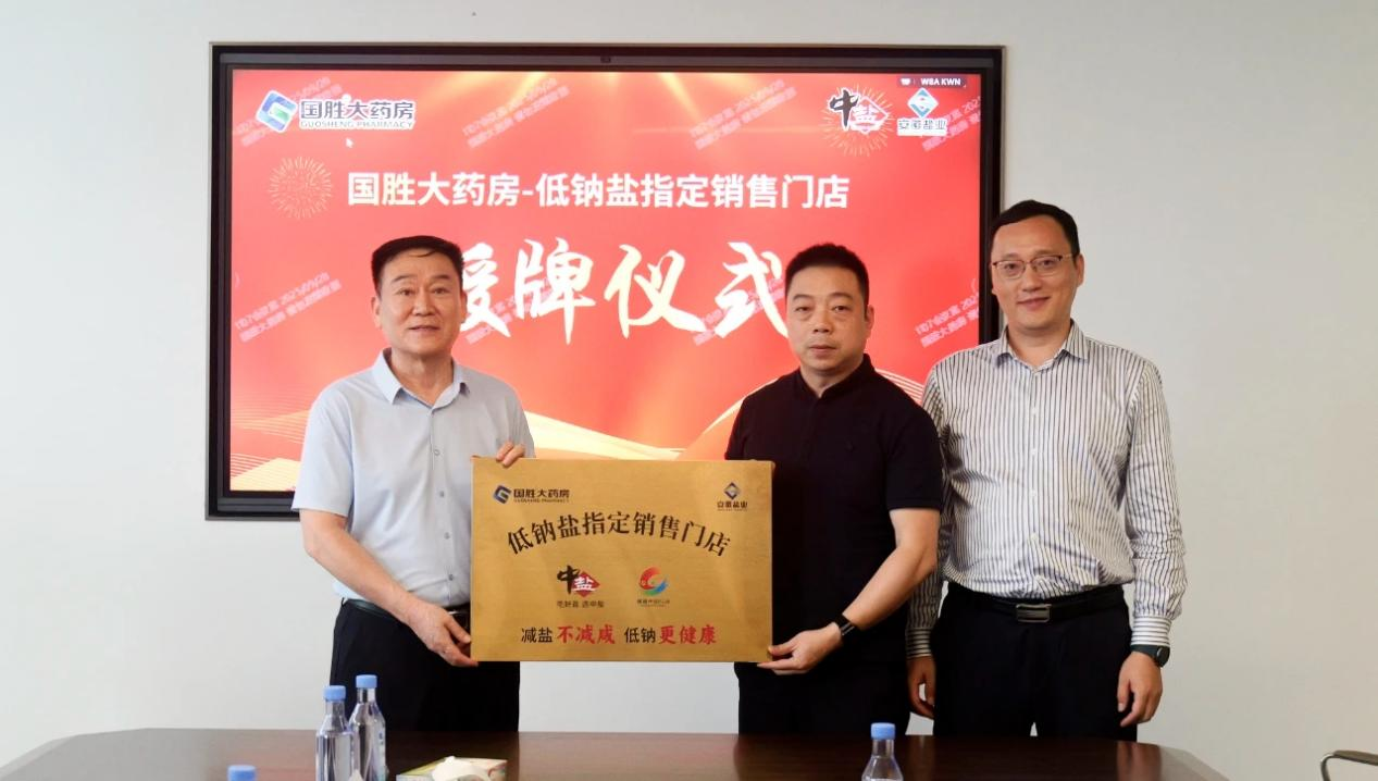 儀式現(xiàn)場(chǎng),雙方圍繞“高鹽飲食危害防控”與“低鈉鹽全民推廣路徑”展開(kāi)深入研討,達(dá)成了“政策同向、使命同頻”的戰(zhàn)略共識(shí),共同致力于將健康干預(yù)覆蓋至家庭單元。隨后,安徽省鹽業(yè)集團(tuán)與國(guó)勝大藥房簽署了戰(zhàn)略合作協(xié)議,安徽省鹽業(yè)集團(tuán)與中鹽東興公司共同向國(guó)勝大藥房授予“中鹽低鈉鹽指定銷售門店”牌匾,宣告低鈉鹽的健康推廣與銷售在醫(yī)藥渠道正式啟動(dòng)。